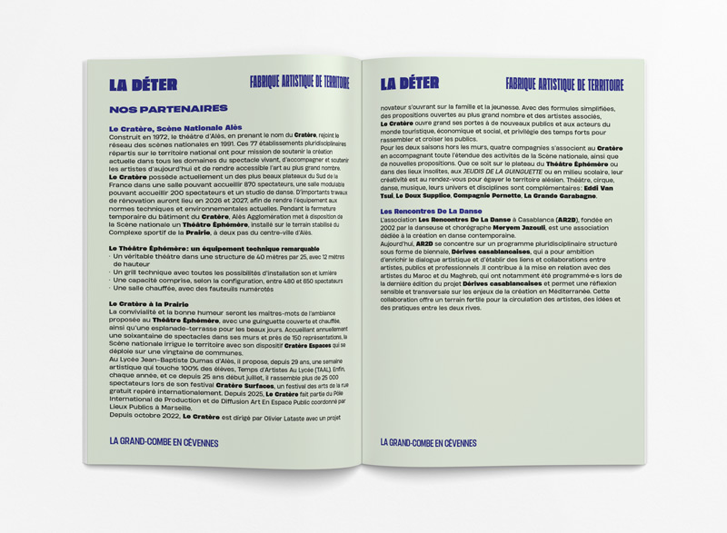 Dans le cadre du projet de coopération artistique Saison Méditerranée 2026 piloté par l'Institut Français, La Déter nous a sollicités pour la (re)création de l'identité graphique de ses supports éditoriaux.